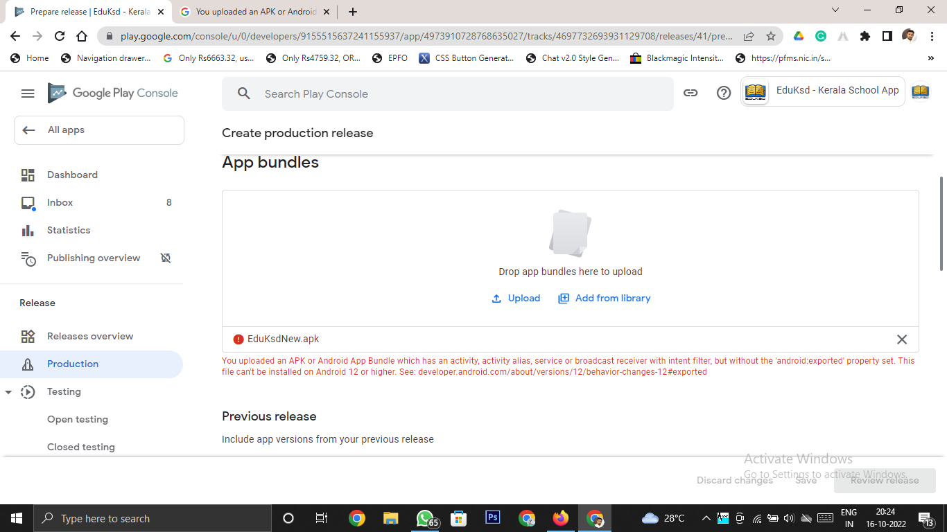 You uploaded an APK or Android App Bundle which has an activity, activity alias, service or broadcast receiver with intent filter, but without the ‘android:exported’ property set. This file can’t be installed on Android 12 or higher. See: Behavior changes: Apps targeting Android 12 | Android Developers