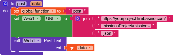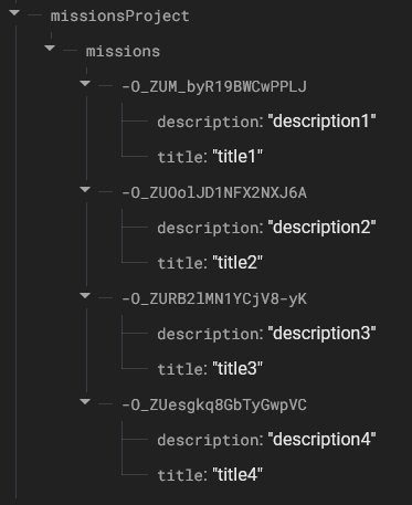 post function takes just one parameter, a dictionary, and will create a node under missions with a unique ID as the key (which also makes data management easier)