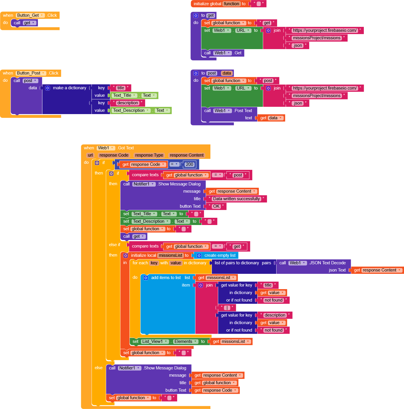 Thanks for your help! Just to clarify: I use the make dictionary block when I create and send data to Firebase (for example in Button.Click), so that the data is stored as a dictionary. But when I read the data back with Got Value, I don’t use make dictionary because Firebase already returns it as a dictionary.