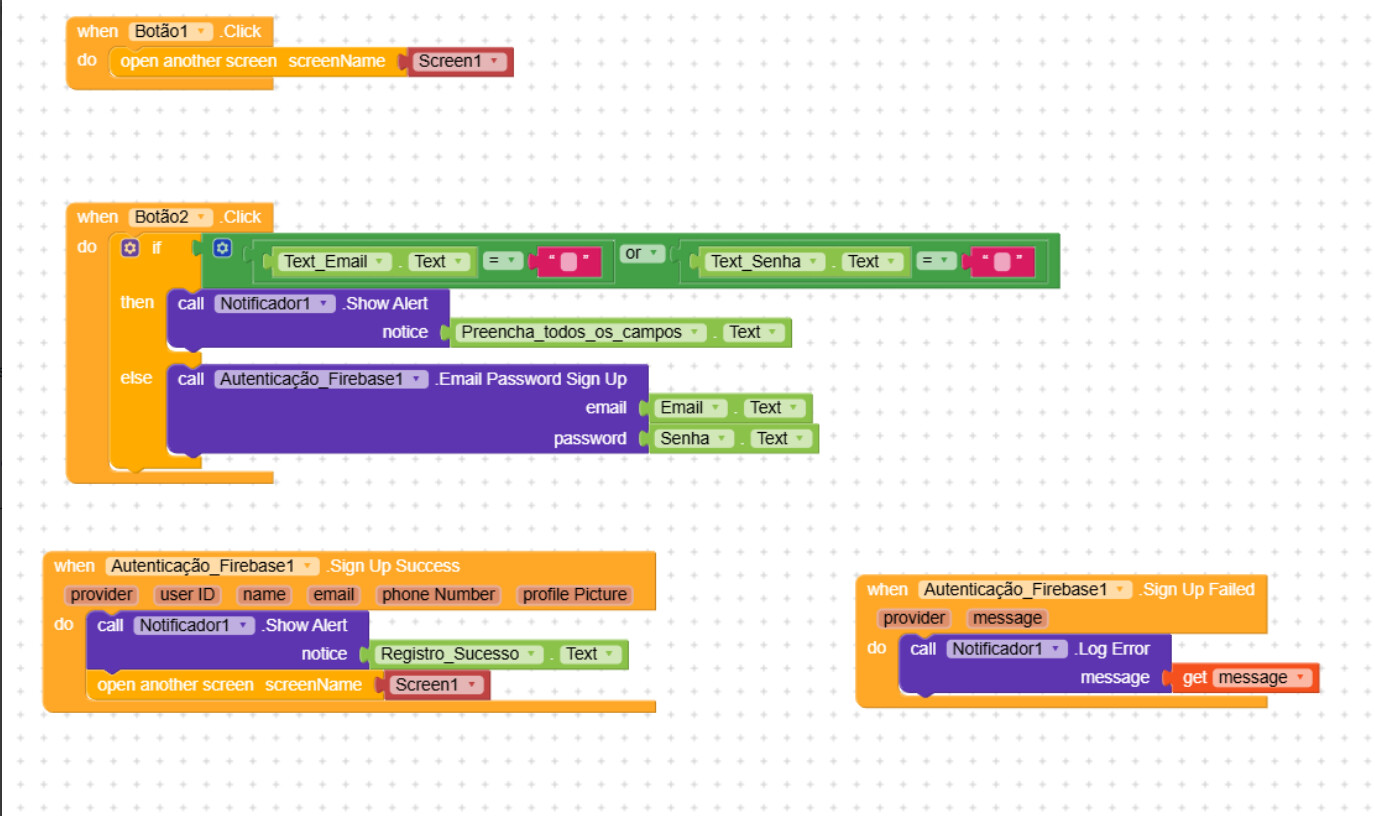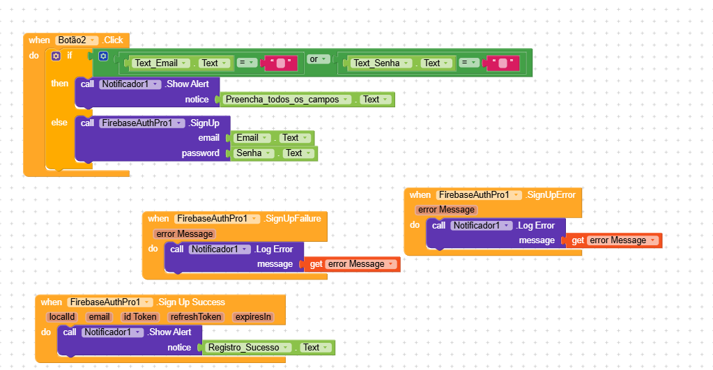 The first problem is that when I try to register the user, nothing simply appears. I type in the email and the password and click on register, but no success or error message comes back. I am using these blocks.