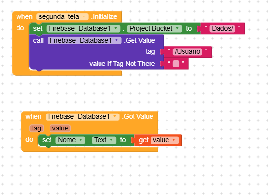 The main issue with your Firebase setup is that you are only using GetValue without ever storing any data, and you are also using a leading slash in your tag. In Firebase, tags should be treated as simple keys, not paths with /. This is why your block with /Usuario does not return anything.