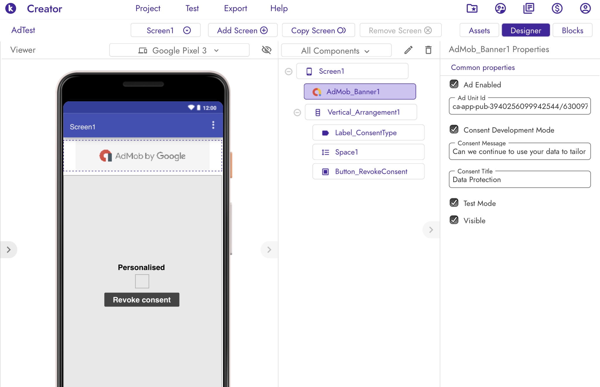 Consent Development Mode checked and Test Mode unchecked - a message told me the app is not approved to serve ads