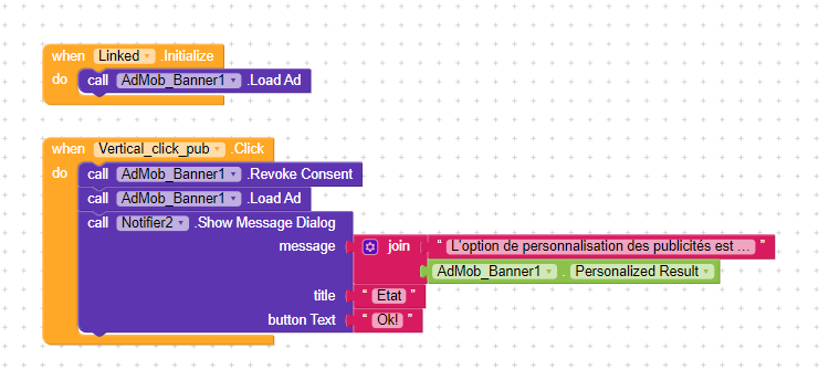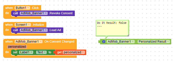 When I first open the app and select Ok it shows true. If I revoke consent then load ad it asks for consent again. If I select Cancel then the label shows False.