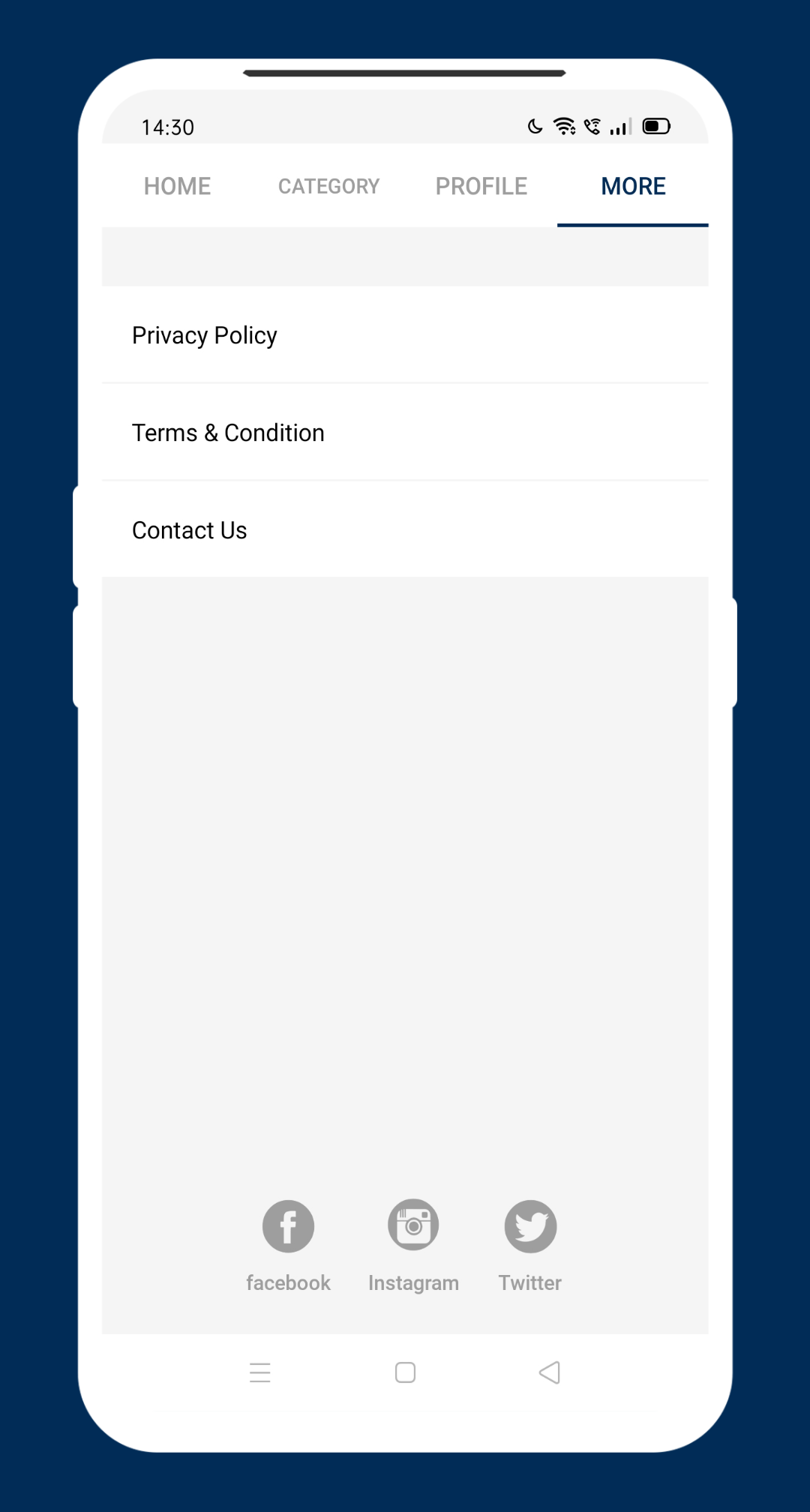 More options (Privacy policy, Terms & condition, Contact us, Follow on social media)
