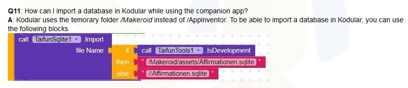 Kodular accesses the database on the default path and you have to make sure to import your initial database