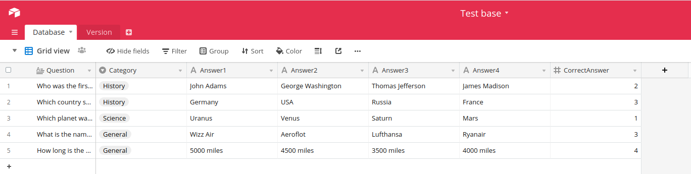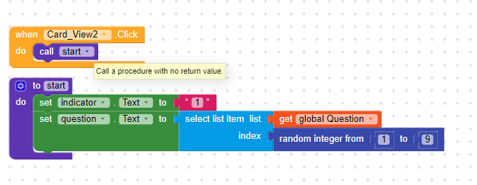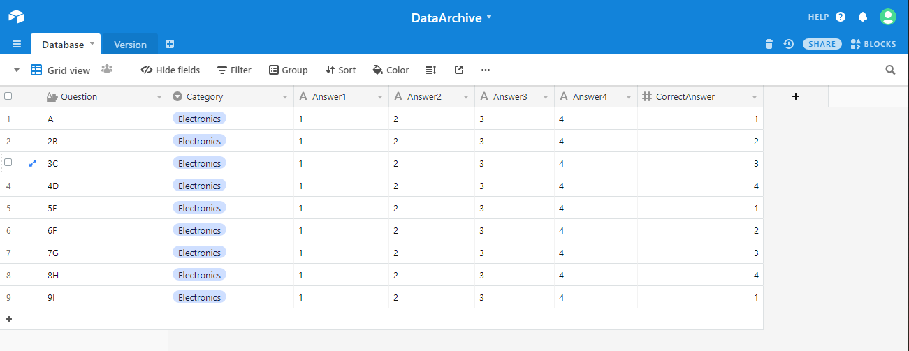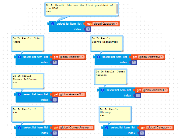 If you followed all the steps correctly you should have in your lists (Questions, Answer1…Answer4, Category and CorrectAnswer) all your data from your Airtable database. Then using the block ‘select list item’ you can choose which item from your list you want to display. The image below will help you.