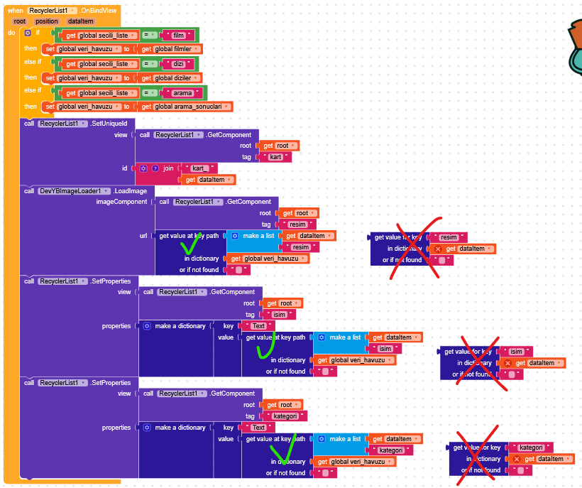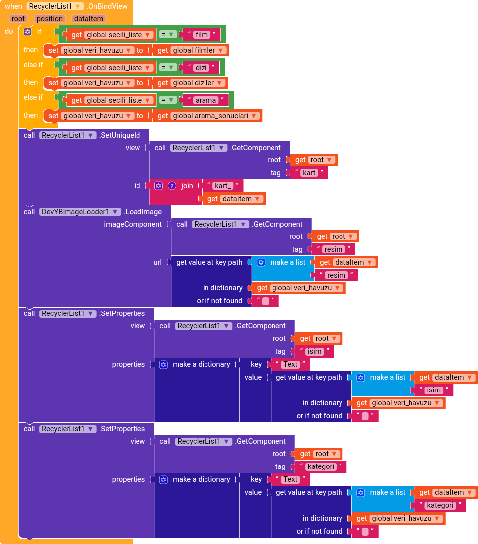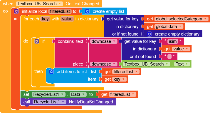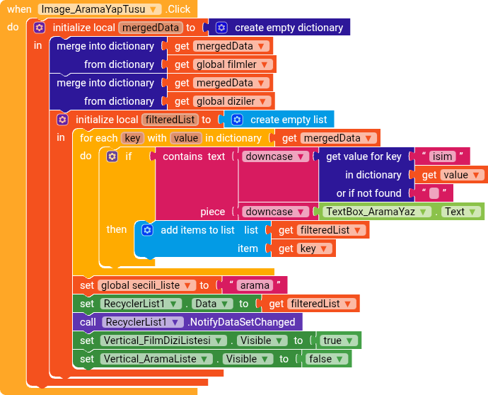 Basically, you merge the two dictionaries filmler and diziler into mergedData, then you loop through all the items and, if the isim key matches what’s in the textbox (all in lowercase), you add the key to a temporary list called filteredList.