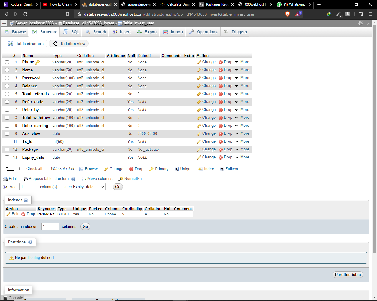 $sql="INSERT INTO invest_user (Phone,Name,Password,Balance,Total_referrals,Refer_code,Refer_by,Total_withdraw,Refer_earning,Ads_view,Tx_id,Package,Expiry_date) VALUES ('$phone','$name','$password','$balance','$total_referrals','$refer_code','$refer_by','$total_withdraw','$refer_earning','$ads_view','$tx_id','$package','$expiry_date')";