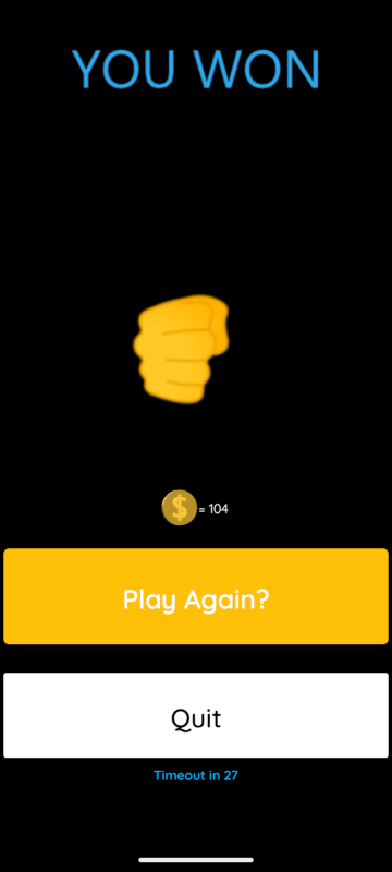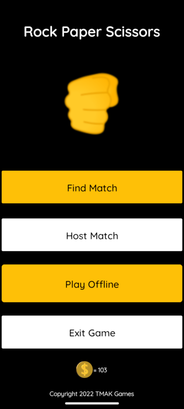 Rock, Paper, Scissors is a classic 2 player game. The rules to win are Rock crushes scissors, paper covers rock, and scissors cut paper. Players can find a match and be paired with other players who are online looking for a match. Players can host a match online and play directly with friends who can join the match. If you don’t have an internet connection there is an offline version. Players who win a match will win a coin and players who lose a match will lose a coin.