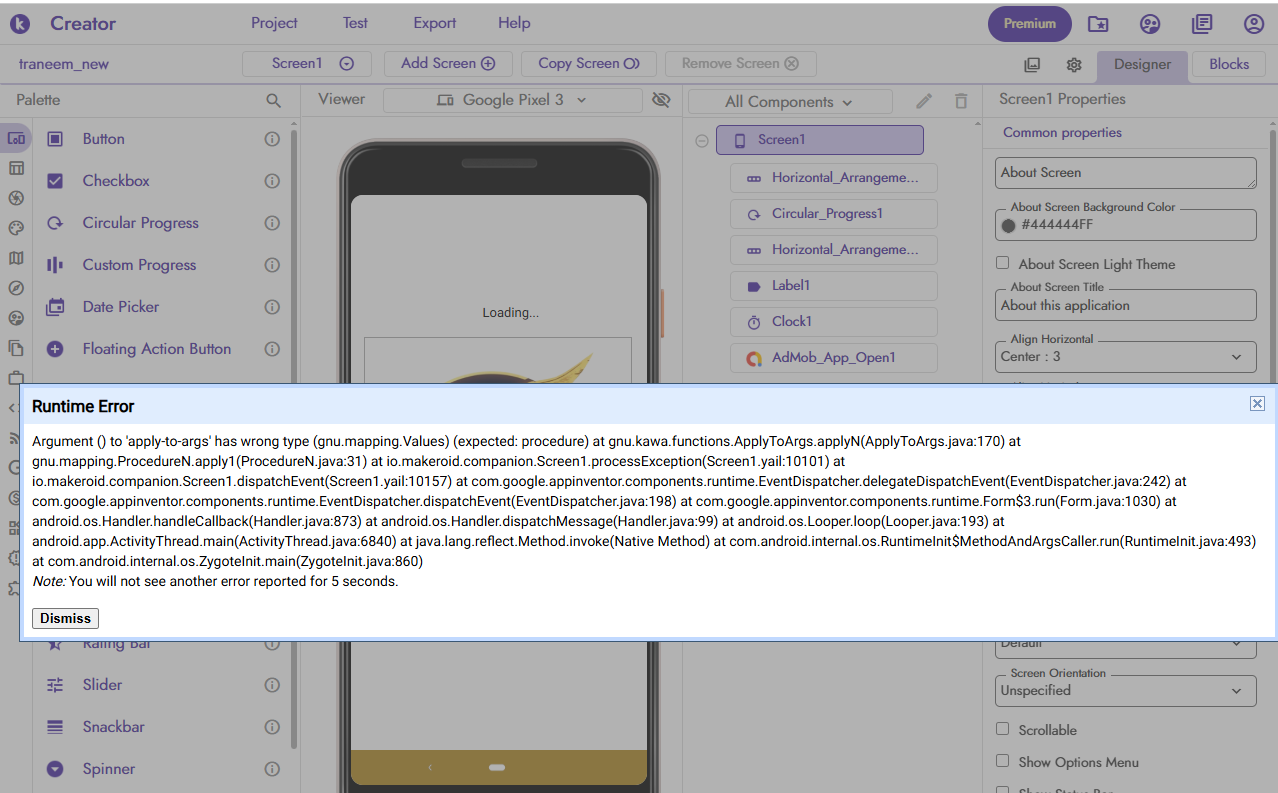 The error appears immediately when running the app during testing, even without modifying any blocks or adding any new components.