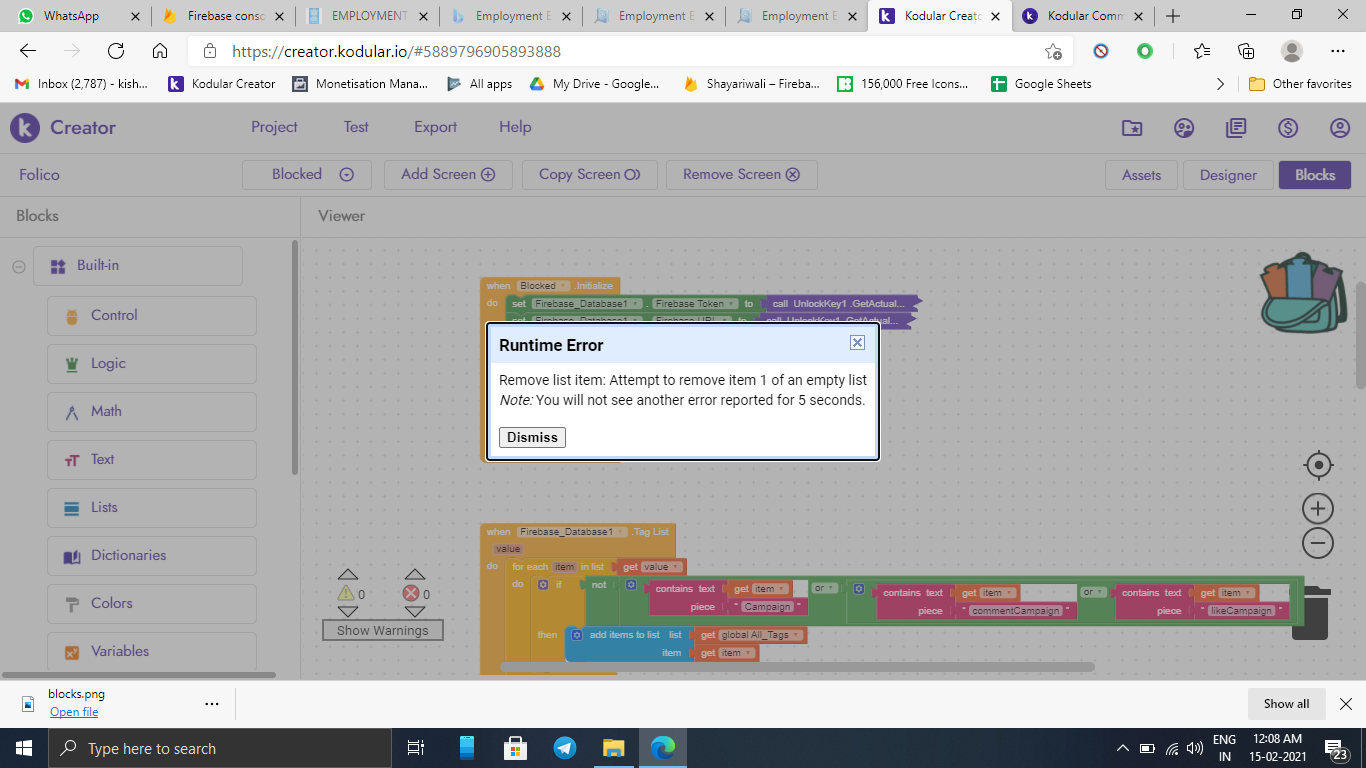 You try to remove item from an empty list. As i said earlier as your blocks goes you add an item only to one list and then you try to remove items from both lists (so the first list can be empty, second list can have some values, but your remove items from both lists at once). I don’t have any further informations about your database structure and those global variables so i can’t be sure if your “if conditions” are sufficient to make it works.