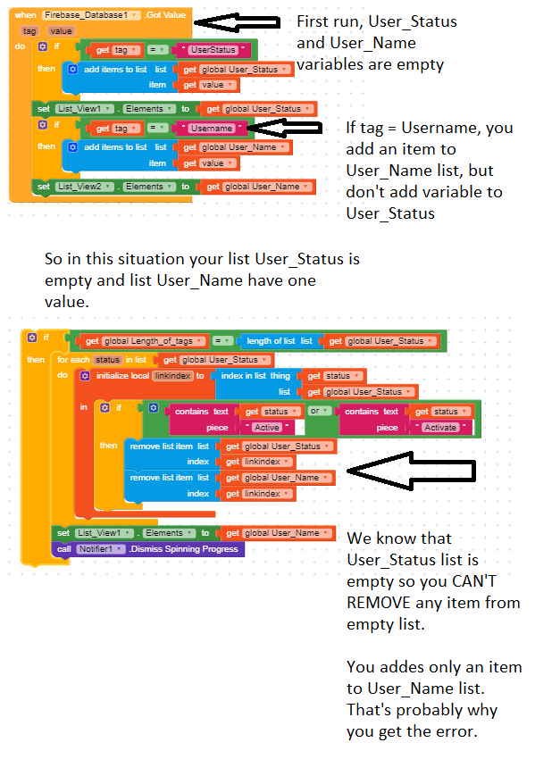 But your block “firebase.Got Value” need 2 runs or more to get all data. At first run you have values only in one list and try to remove values from both lists.