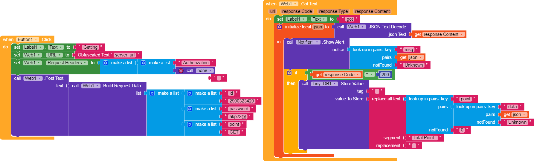 Now, as you can see this are the blocks. In this blocks, after button 1. click I have to set url then, i request headers and then, I post a command to get point. And same blocks working fine in other builders but, in kodular web got msg “invalid parameters. kindly check and try again” and data from server is empty. I have deleted procedure in headers because of security purpose.