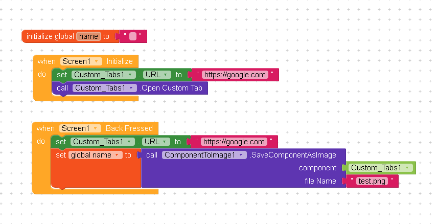 Argument #2 (com.google.appinventor.components.runtime.Maker…) to ‘com.vic.componenttoimage.ComponentToImage.SaveComponentAsImage(com.google.appinventor.components.runtime.AndroidViewComponent,java.lang.String)’ has wrong type (com.google.appinventor.components.runtime.MakeroidChromeCustomTabs) (expected: com.google.appinventor.components.runtime.AndroidViewComponent) Note: You will not see another error reported for 5 seconds.
