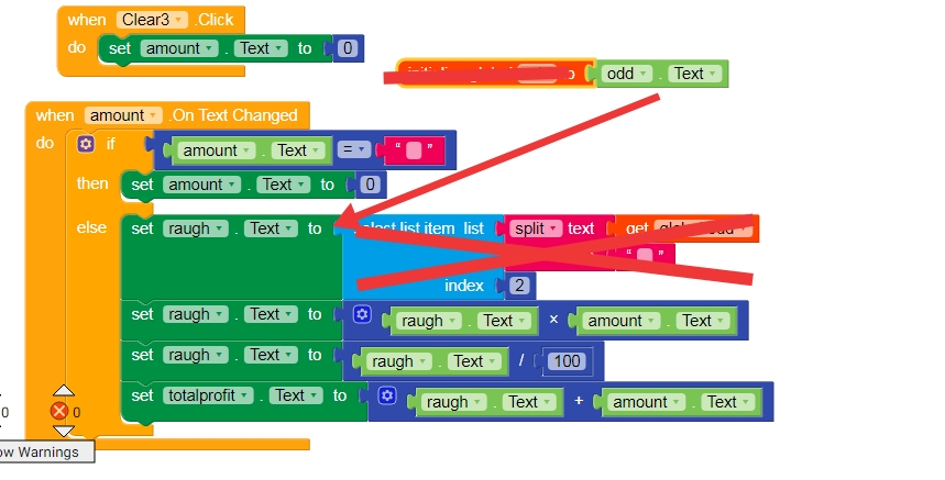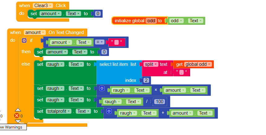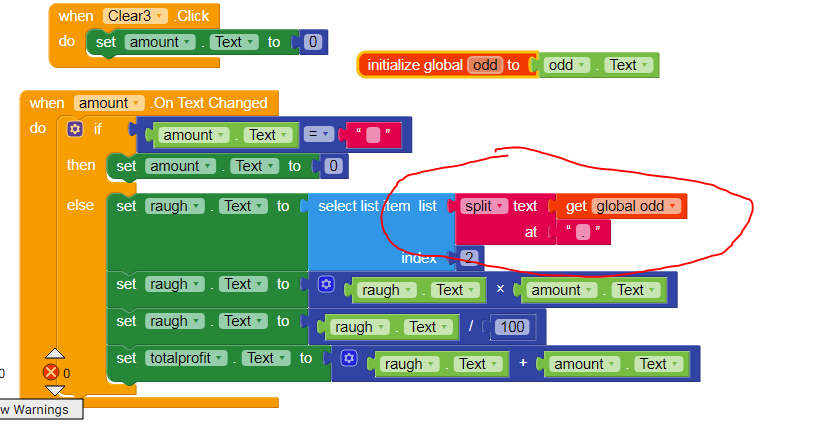 Why you are using set amount to 0? When you multiply rough to amount 0 its gives result 0 , And also, set odd veriable text when text changes not in initialize like you did, that time maybe odd text is also zero , and you can’t split text 0 and get There index 2,
