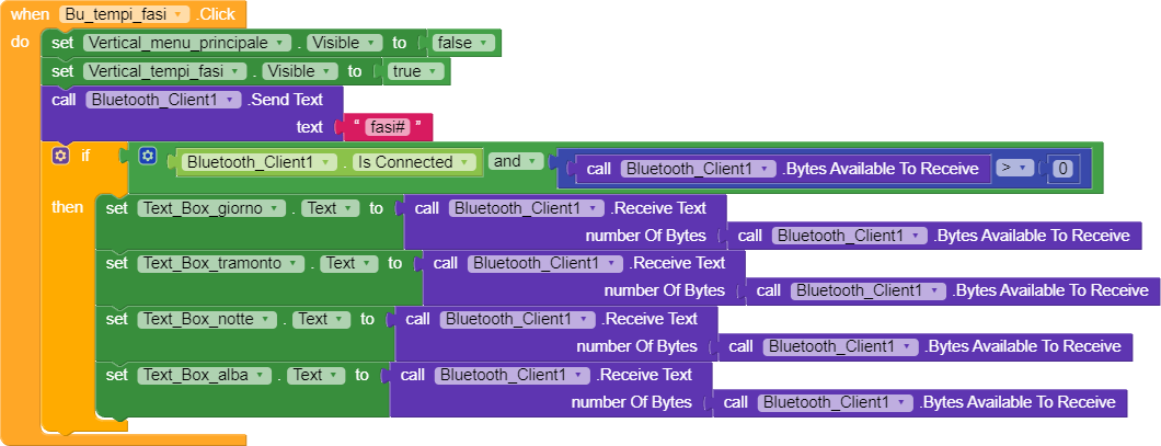 On my phone I have a menu, when I click on the “Phase time” button, kodular sends the word “phases” and the ESP32 enters the phases menu. First it sends the phase values to kodular with the code posted above, then it should do other things that I still have to write because I can’t get this to work. Kodular should read the 4 values and display them in 4 Text_Boxes. Below I post the blocks on Kodular.