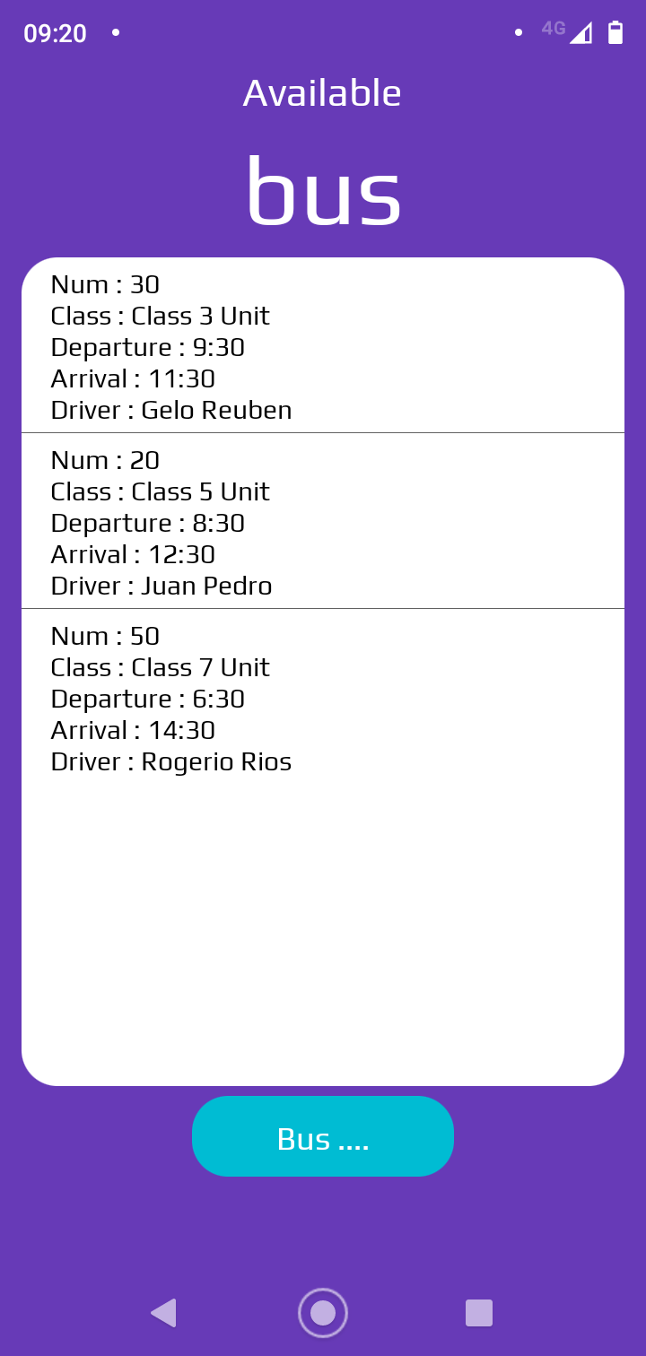 [{“plate_num”:“30”,“b_class”:“Class 3 Unit”,“b_dep”:“9:30”,“b_arriv”:“11:30”,“b_driv”:“Arnel Ignacio”},