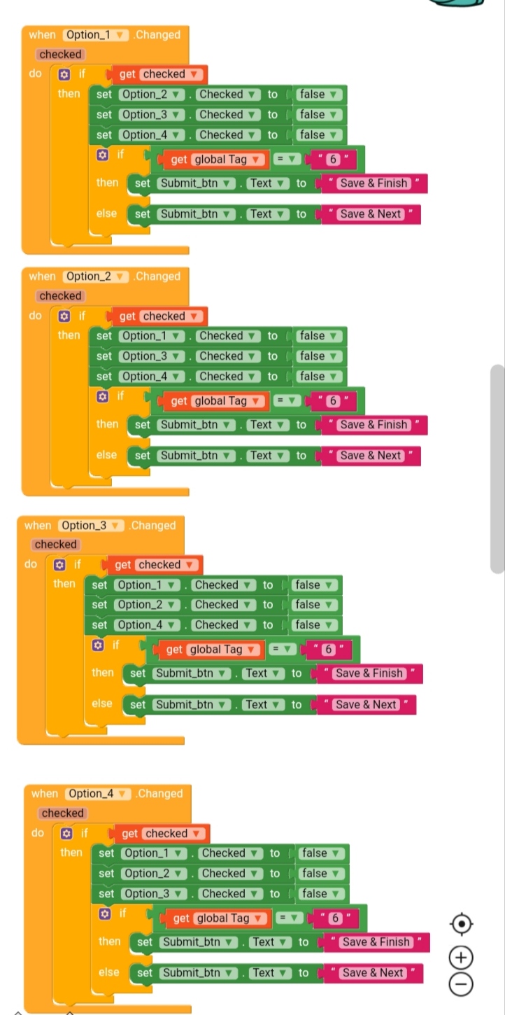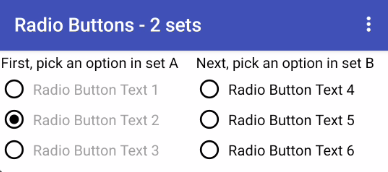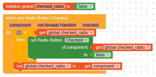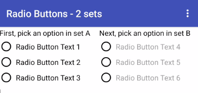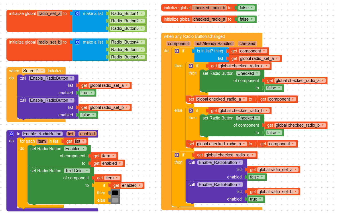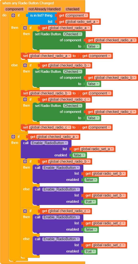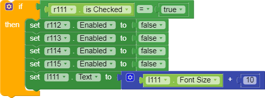 this app ther are 3 colmns of 5 radiobuton on one side 3x5=15. corespondng ther are 5 boxes for values. . if i select 1 buton in a column, then other butons must become disabled. and depending on which buton is select, text box must get some value. same with second colum and thir colum. once one radiobuton is check, then that colom is locked. this block is not at al working. plese help with short cod as i has to do for many colums. im a newbe