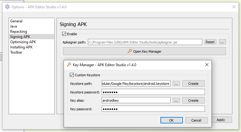 Remember to correctly configure the tool, setting the path to Java and including your keystore, so that the app is recompiled, signed and aligned.