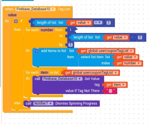 Its showing incorrect list items when get taglist from firebase. I want from 1 item to length of list - 1. Here i attaching my blocks and database taglist.
