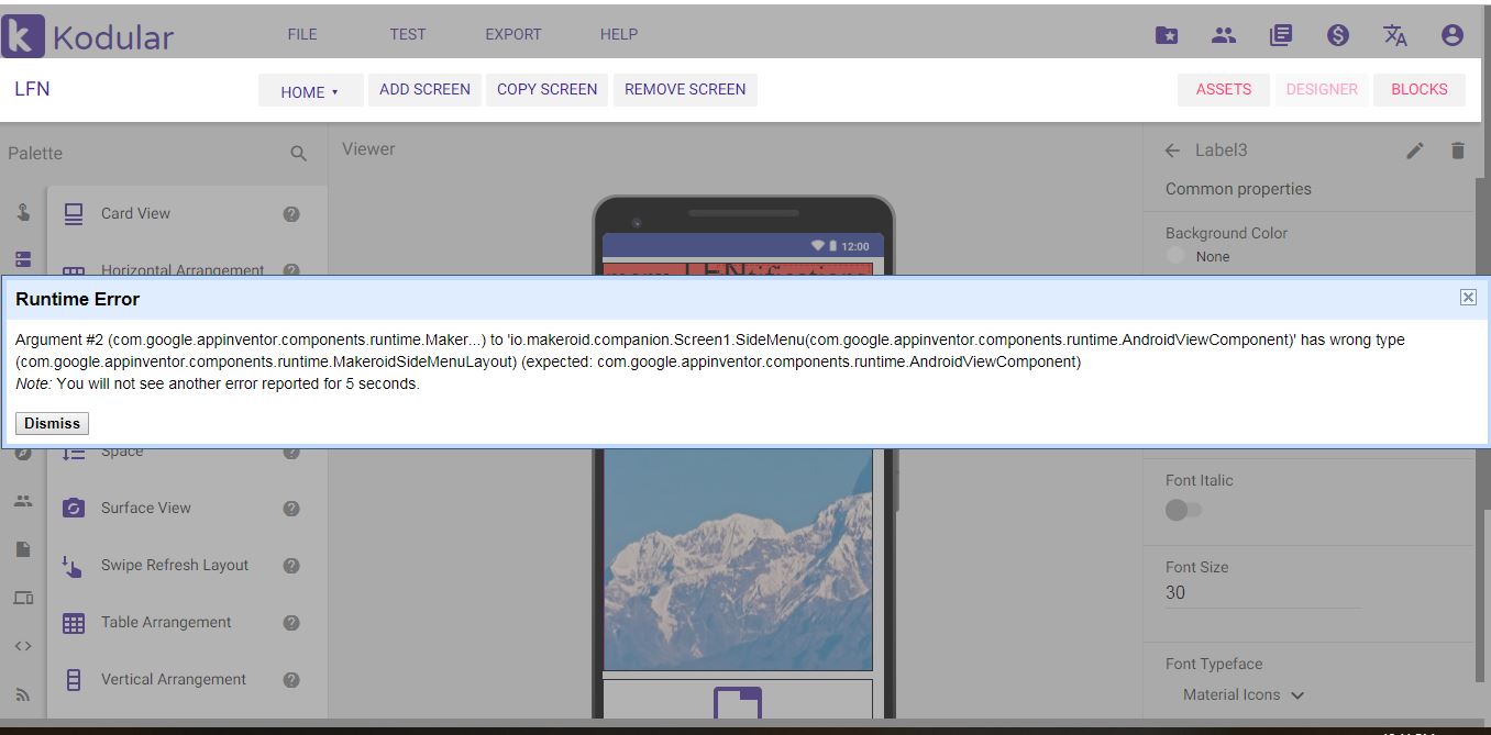 Argument #2 (com.google.appinventor.components.runtime.Maker…) to ‘io.makeroid.companion.Screen1.SideMenu(com.google.appinventor.components.runtime.AndroidViewComponent)’ has wrong type (com.google.appinventor.components.runtime.MakeroidSideMenuLayout) (expected: com.google.appinventor.components.runtime.AndroidViewComponent) Note: You will not see another error reported for 5 seconds.