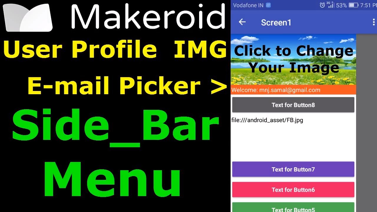 In this App/Video I have explained how you can create an App which allow user to change his Image in the sidebar menu (initially a default Image will show) and can pick his email account by using the Google Account Picker. And all will save in a TinyDB to restore image when App re-open.