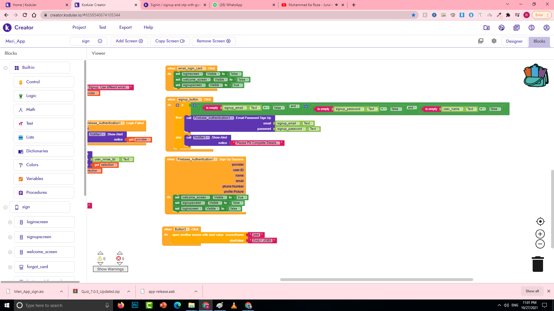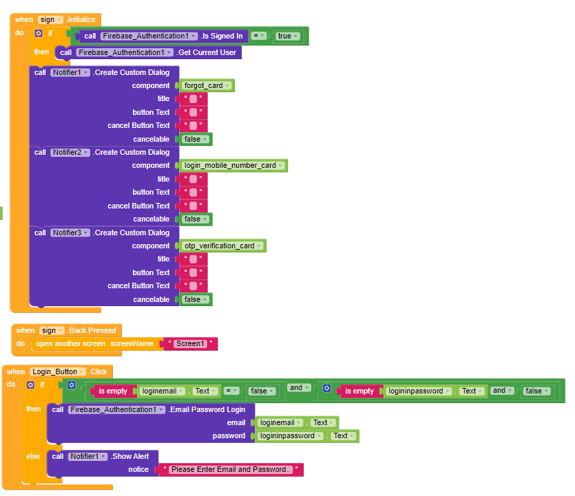I made Signin / signup and otp with google authentication, it signin and signup successfully. But no data shown in firebase. I am sharing .ais file, plz someone who make this coding with blocks , where it should be one one time login via otp, email and google and also single device can create only one account, i will be thankful to person who will help me. All coding is done but there need some changing. Also if it possible needs some coding when someone login, after passing 15 days i can disable him…Is there any generous coder to help me…