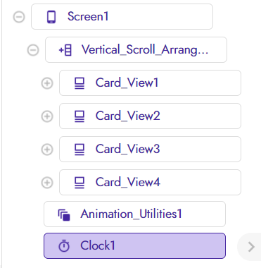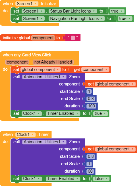 The blocks are pretty simple. We have to focus on the timing of the animation and everything would be fine. Here on the CardView click event, I have shown an animation to the component stored in a variable named component. When any card view is clicked then it is stored in the same and animation utils animate the same and shrink the size and set the clock timer to enable to true. then on Clock time, event animation utils bring the component back to its original size.