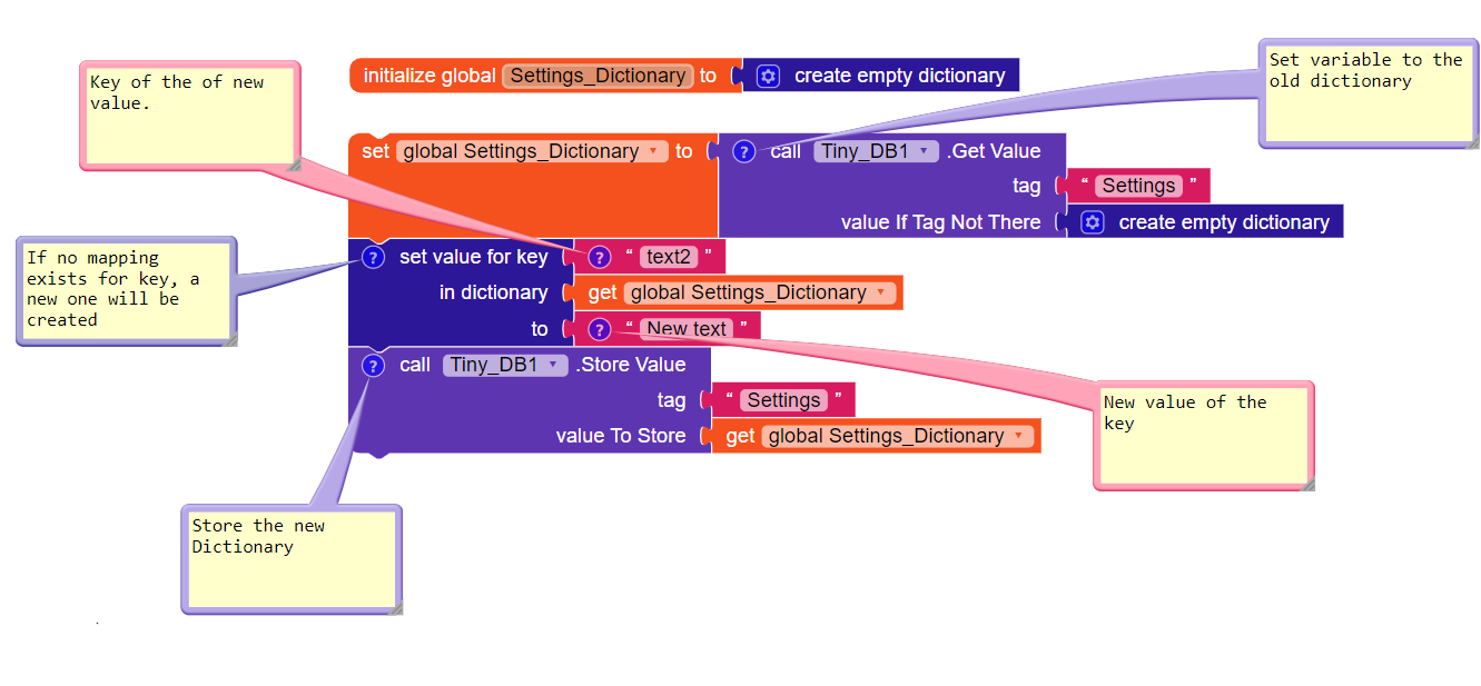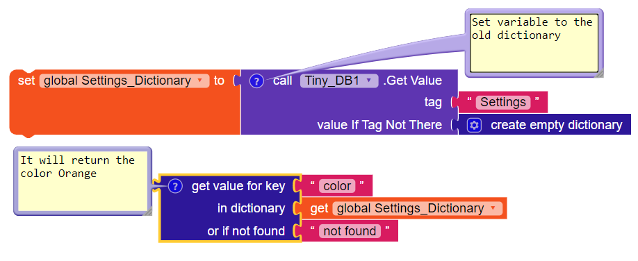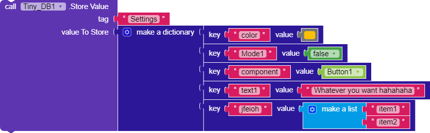 When there are so much data you have to store, you don’t wanna store it by running the call tinyDB store block. Therefore, the dictionary component comes in handy.