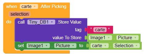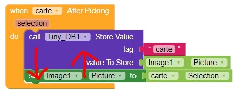 As I said before, TinyDB can’t store images. What you can do is encode your images into Base64 hash, save the generated hash in a TinyDB and decode it before you set it as an imageview’s picture. To encode/decode the images in Base64, you can use these two methods from Cryptography component ![]()