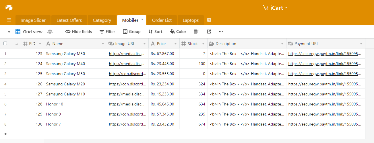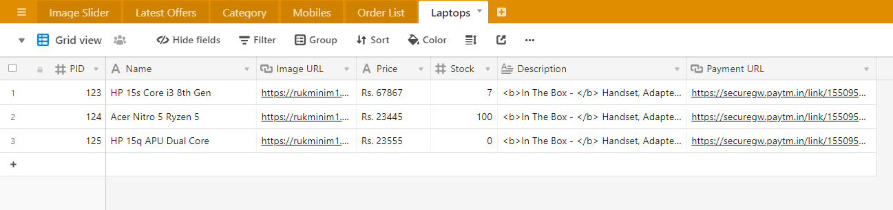 i am making a simple ecom app and i was working with the Mobile database only and everything was working ok. but when i started multiple tables for example Laptops then the data is not in the same order. FYI i duplicated the mobile table and changed its name only to Laptops.