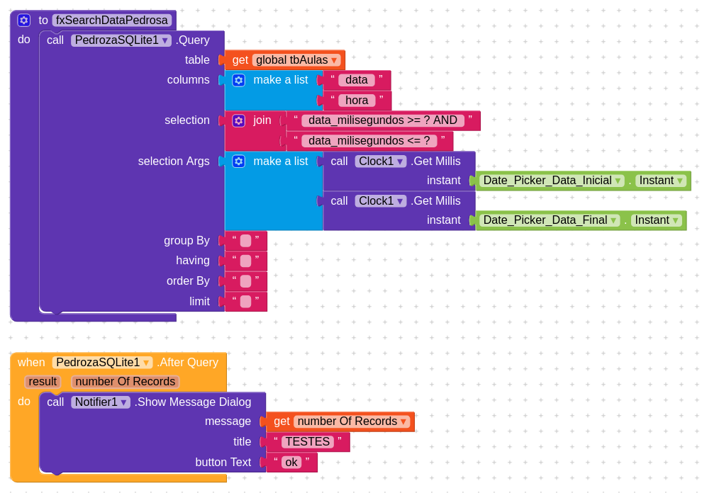 “SELECT … WHERE date_milisecs >= Clock1.getMilis AND date_milisecs <= Clock2.getMilis”