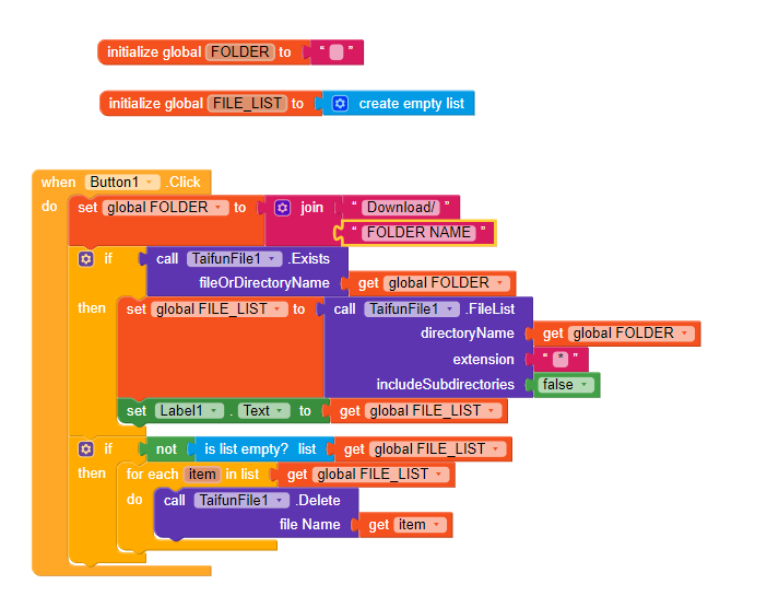 And with this blocks you can delete all files in a folder from “Download” (Download/NAME_FOLDER )
