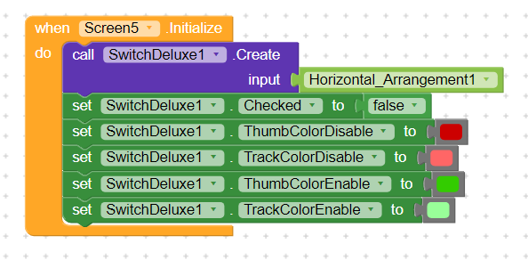 Try this blocks, they will create a switch. By the way you can create procedures for active and inactive switch color using Kodular’s switches