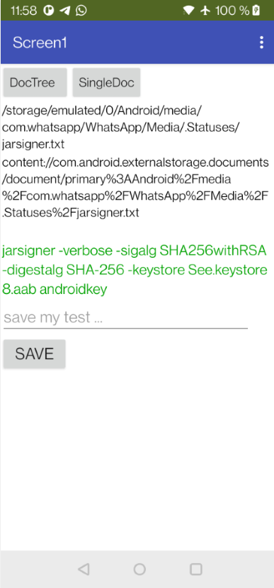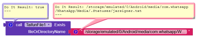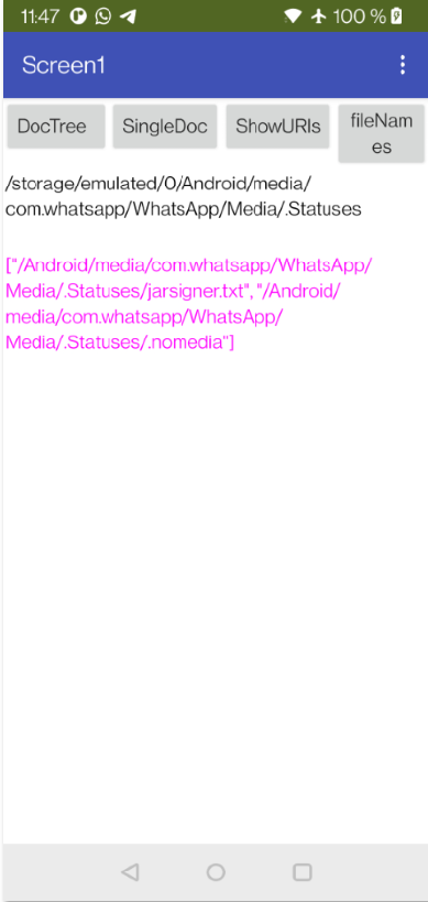 Since I have never used WhatsApp and never will, I took a device from my kids who are unhappily using WhatsApp. I copied a text file into the folder /.../Statuses, list the files there and read the text file: