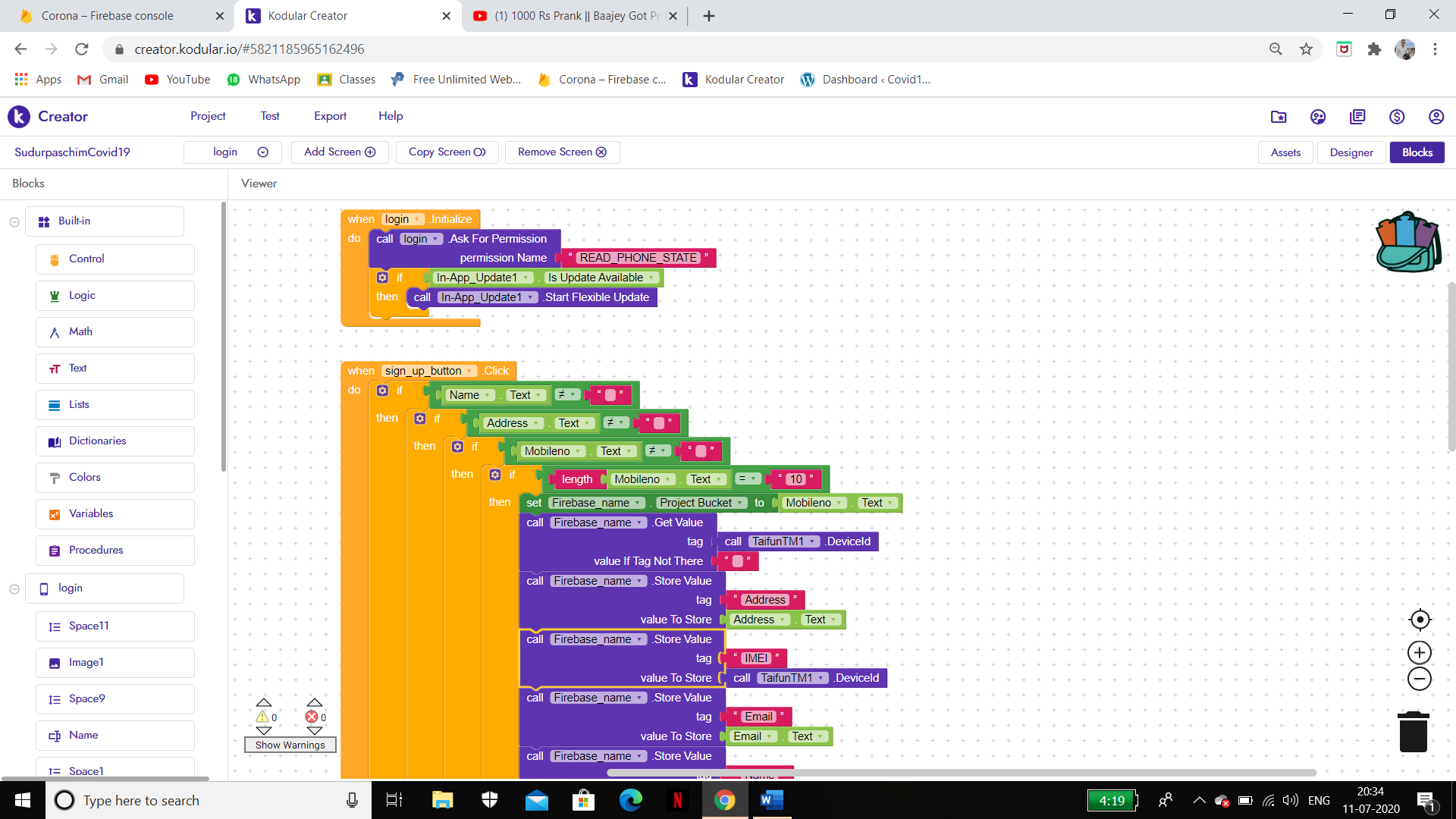 Im using TaifunTM1 extension to store IMEI number but it didn’t work. I really need it please once have look on my blocks.