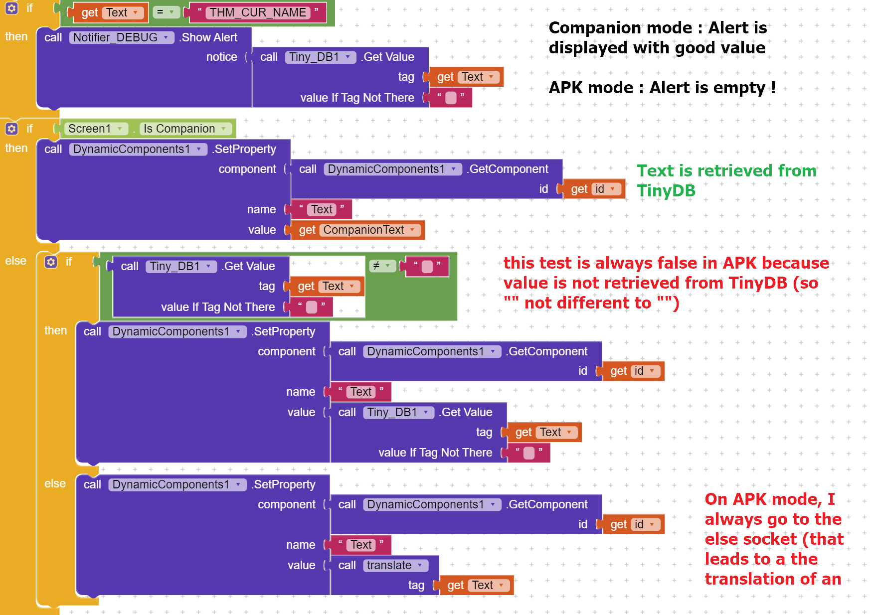 On APK mode, the value is not retrieved and it leads to the translation of something that doesn’t exist (the TinyDB tag). However on companion mode the value is retrieved