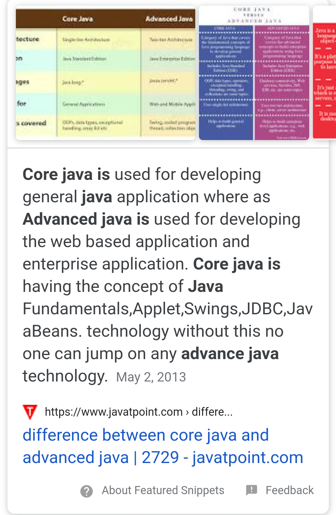 Core java is used for developing general java application where as Advanced java is used for developing the web based application and enterprise application. Core java is having the concept of Java Fundamentals,Applet,Swings,JDBC,JavaBeans. technology without this no one can jump on any advance java technology
