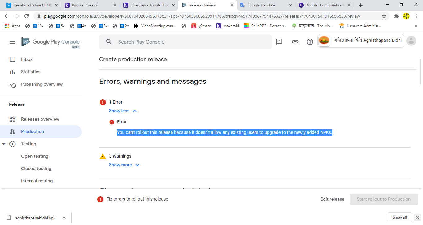 “You can’t rollout this release because it doesn’t allow any existing users to upgrade to the newly added APKs.”