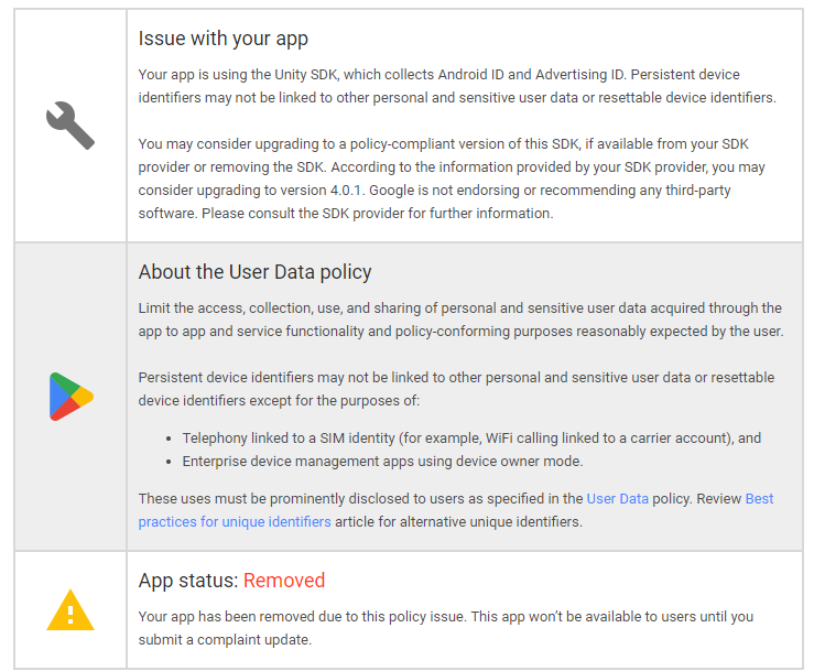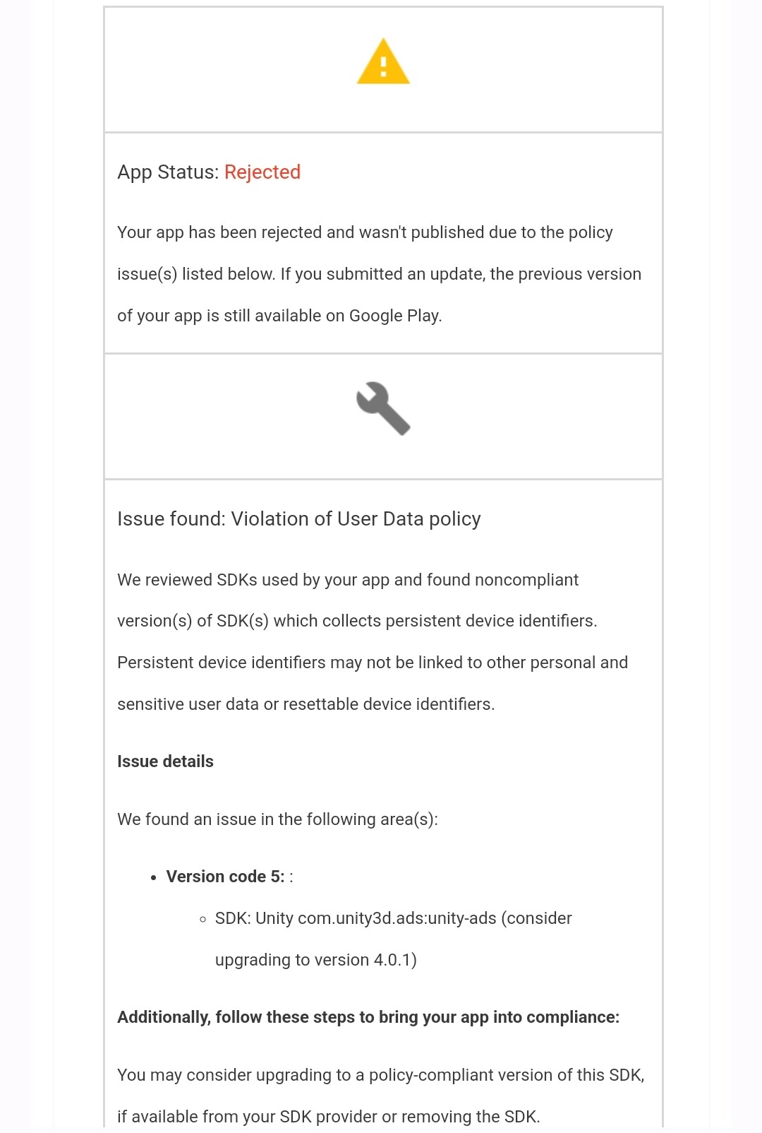 My app also didn’t use Unity SDK, just Google ads was added, but now the app was removed from Play Store because of Unity SDK issue.