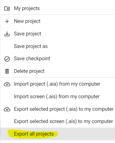 “Export All Projects” also exports the keystore along with all the projects’ AIA files. So, if someone wants to take a backup, then this is the right option.