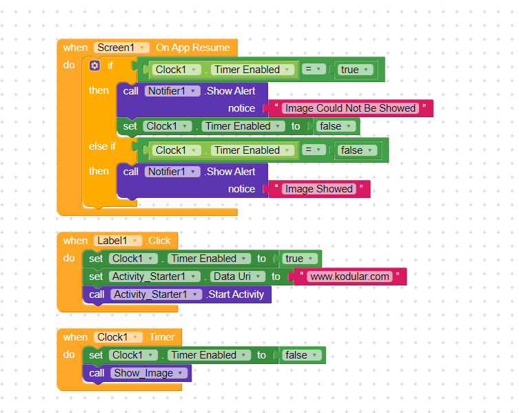 When I click Label1 I’m enabling Timer to true with timer interval to 8000 ( 8 Seconds ) After 8 Seconds if I don’t get back, Timer should fire and show image. If I get back before 8 seconds, Image should not be showed On App Resume. This should work but it’s not and timer never fires