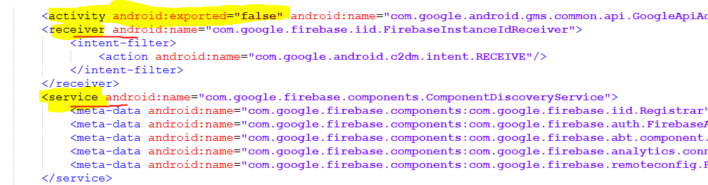 P.S. I can also mention that the Push Notifications component  is not adding  android:exported=true or false to all lines.. @pavi2410