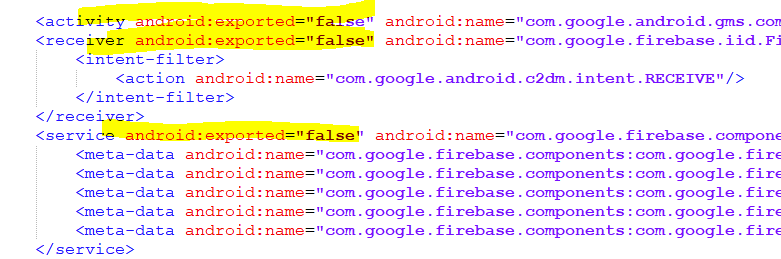 by adding  android:exported="false" to the missing receiver and service, I was able to install app..