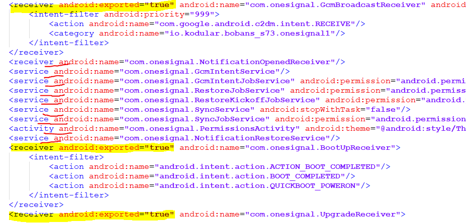 It seems that the OneSignalFix extension  is not adding  android:exported=true or false to all lines..