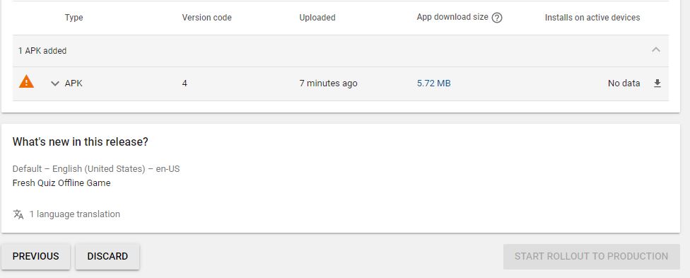 You can ignore the warning (sometimes it’s something about unused code being sent to users). Make sure you do the content rating and complete other required steps. Start rollout to production button would become enabled then.