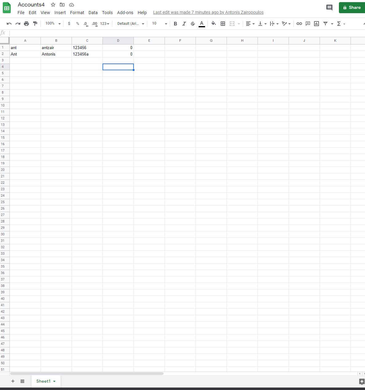 var data =[e.parameter.name, e.parameter.username, e.parameter.password, e.parameter.counter];