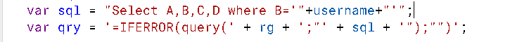 var qry = ‘=IFERROR(query(’ + rg + ‘,"’ + sql + ‘“),”")’;