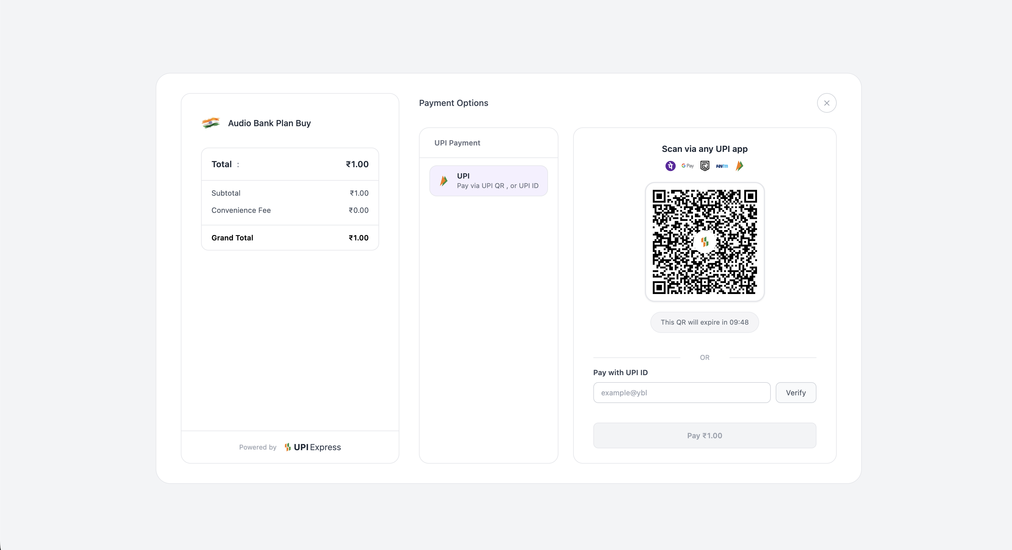 UPIExpress supports multiple payment methods in a single flow: