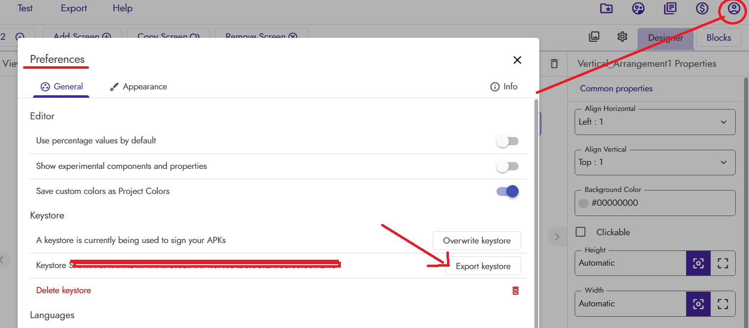 To export keystore in Kodular - go to account - Preferences - export keystore